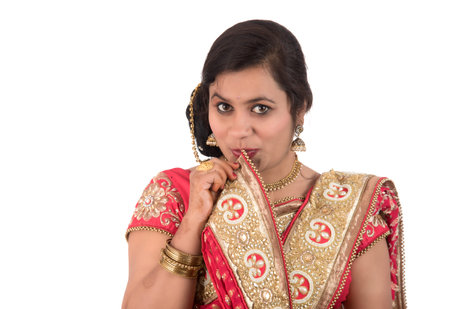 Beautiful young girl posing in Indian traditional saree on white background.