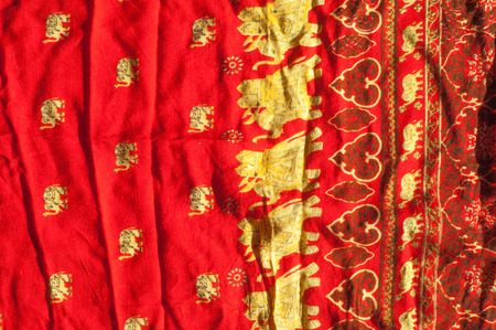 The texture of cotton fabric, with red painted elephants, made in India