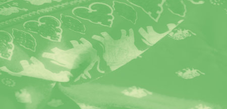 A blurry green fabric adorned with intricate white floral patterns, flowing gently to create smooth, soft folds. The texture captures the essence of serenity, ideal for an elegant presentation.
