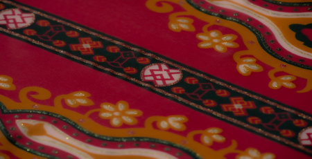Blur - Close-up of artisan fabric with dynamic floral patterns and symmetrical motifs in vivid red and green hues, enhanced by glittering embellishments.