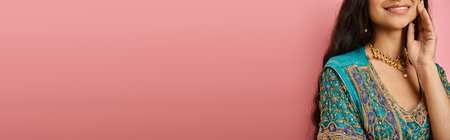 joyful indian woman in traditional costume smiling happily with hand near face, cropped, banner