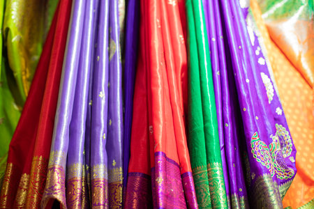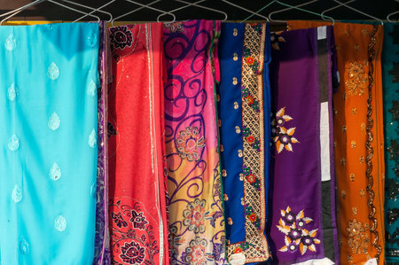 Close-up view of Indian woman fashion embroidered saris or sarees in shop display
