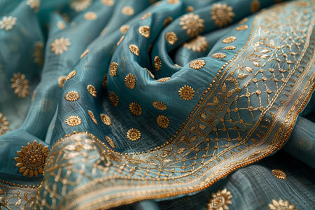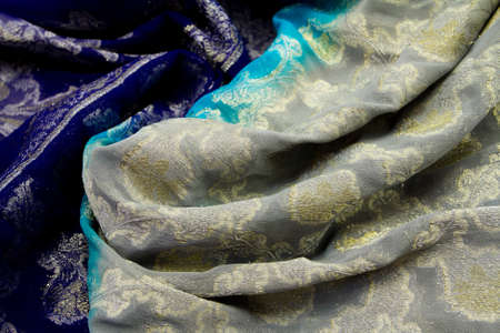 blue indian saree with floral pattern. macro photo. selective focus