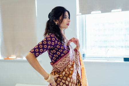 Indian woman delicately putting traditional beautiful saree and traditional jewellery getting ready for ethnic festive celebration. Indian culture and ritual holidays in modern life. Selective focus