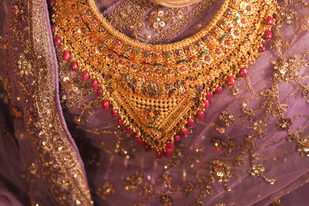 Indian red cloth with gold border sari and jewelry on a light background. wedding dress