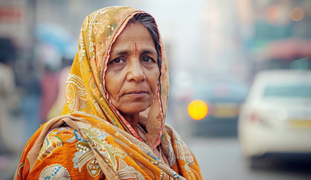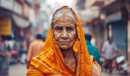 portrait of a native old Indian woman in national clothes in the city, personifying the national image of an Indian woman