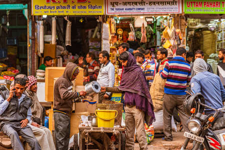 Old Delhi, India- February 2020: Street vendor pours cup hot tea Indian style or chai for customers from his shop along street at historical part of old Delhi area, India.