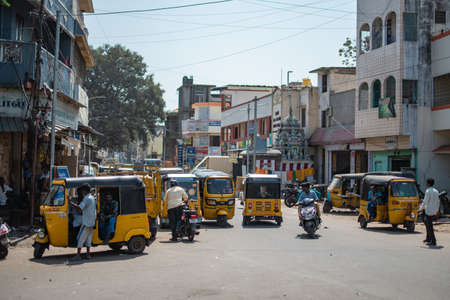 Chennai, India - February 8, 2020: Traffic with many traditional yellow taxi auto rickshaws on a street on February 8, 2020 in Chennai, India