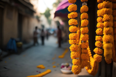 Marigold flower garland on the street of Kathmandu, Nepal. AI generated selective focus bacground with marigold garlands on Indian street