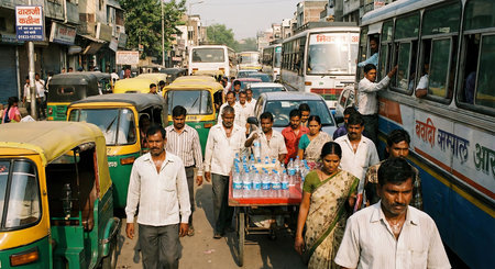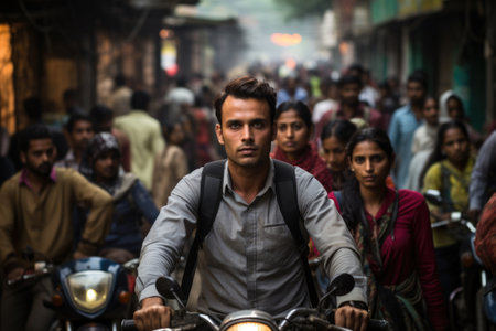 Tourist at busy indian or pakistan street. Crowded street in rush hour