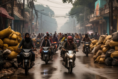 Varanasi, Uttar Pradesh, India. Indian women carry things on their heads and going through Traffic On Street in . Tuk-tuk cycle, bikes, motorcycles Moving On Street. .