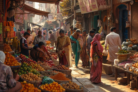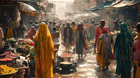 A bustling marketplace scene features diverse individuals in traditional attire. The image displays a range of colors and textures, capturing the essence of the setting. The composition suggests an outdoor environment, possibly during daylight hours. Suitable for various editorial and commercial applications.
