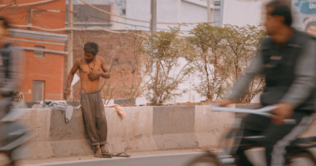 New Delhi, Delhi, India. Indian man changes clothes on the street. Traffic On The Desh Bandhu Gupta road street. Cars, Motorcycles, Auto Rickshaw Or Tuk-tuk Moving On Street In morning