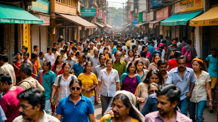 A diverse crowd of individuals walking in unison down a busy urban street, A busy street during Eid celebrations, AI Generated