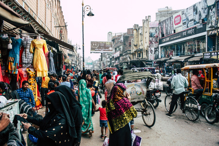 Delhi, India - January 27, 2017: ordinary crowdy city life at Chandni Chowk, Old Delhi, famous travel destination in India. Fisheye view.