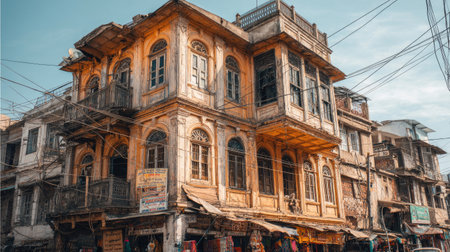 A vintage building with intricate facade details is displayed under daylight conditions. The aged structure exhibits numerous windows, balconies, and a multi-story composition. Weathered textures and warm colors highlight the classic architectural design. This image may be used for historical documentation, urban planning, or design publications.