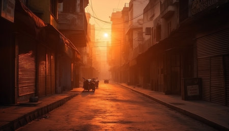 Traffic on empty street in jaipur at dusk with golden light and autorickshaw bikes on the roads