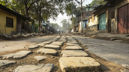 A captivating view of a cobblestone street captured from a low angle, showcasing colorful buildings and soft morning light. Perfect for travel and urban themes.