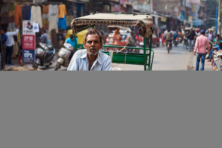 Varanasi, Uttar Pradesh, India. Trishaw cycling in Traffic On Street.