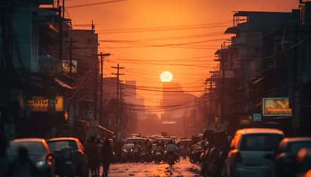 The vibrant city skyline illuminates the crowded streets at dusk generated by artificial intelligence