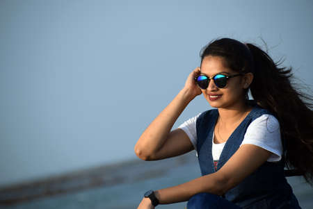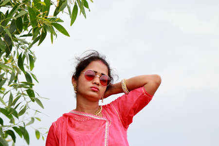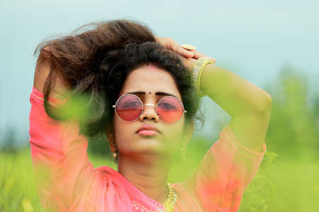 adult female model posing in a beautiful traditional dress and wearing new style sunglasses above the eyes, Summer fashion, promotion and indigenous practice of Indian culture, nature of natural beauty