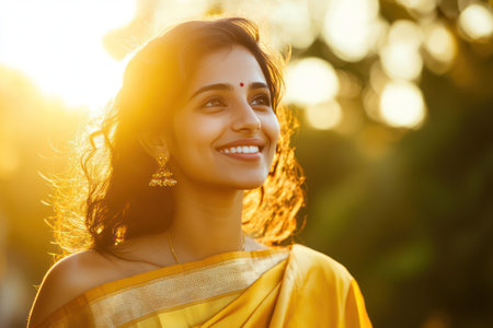 Elegant woman in golden-yellow sari smiling warmly in natural light, symbolizing cultural pride, confidence, and graceful beauty.