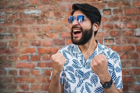 Young handsome man wearing summer clothes and celebrating victory against brick wall. Urban and success concept.