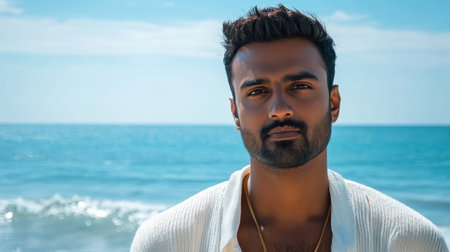 A man stands confidently by the beach, wearing a light sweater. The sunlight reflects off the clear ocean, creating a serene atmosphere during a beautiful day.