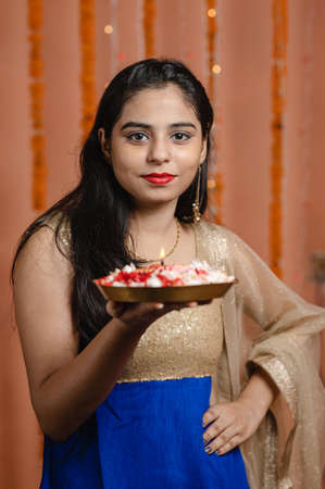 Beautiful Young Indian woman holding burning Diya and looking at camera. Diwali or deepawali celebration with light and flowers decor in background.
