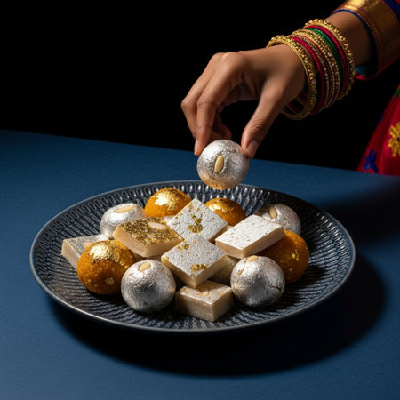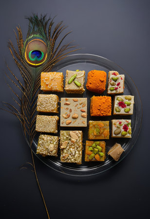 An assortment of colorful traditional sweet treats displayed artistically with decorative elements