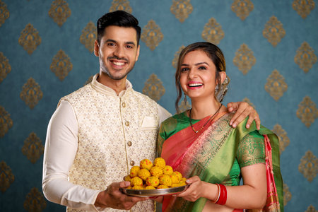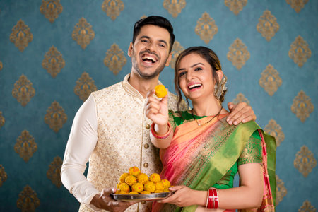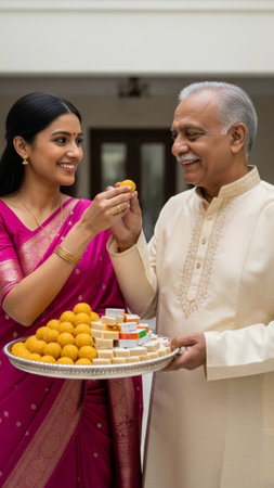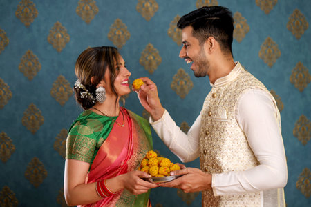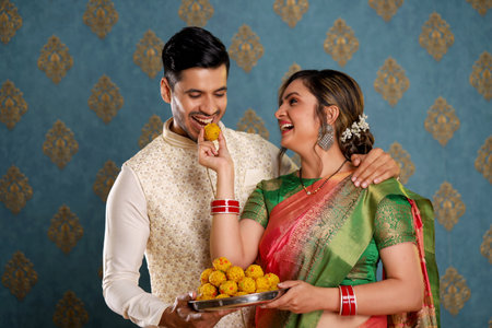 Indian couple in traditional clothes eating and celebrating Raksha Bandhan festival