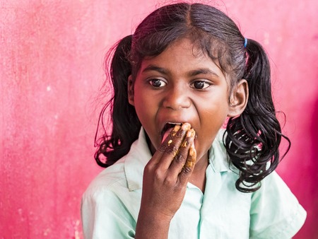 PUDUCHERY, INDIA - DECEMBER Circa, 2018. Portrait of unidentified handsome cute smiling indian girl outdoors, eating plate of rice. Concept of joyful even if they are poor people.