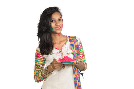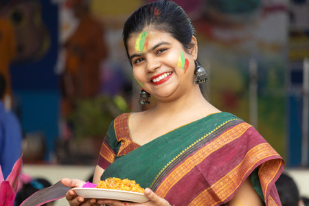 Beautiful young Indian woman with her face painted during the Holi festival in India