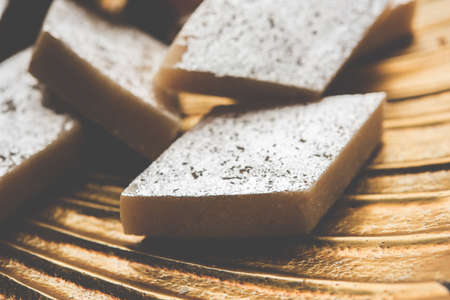 Stock photo of Kaju Katli, a popular indian sweet burfi made using milk, khoya, cachew and Sugar