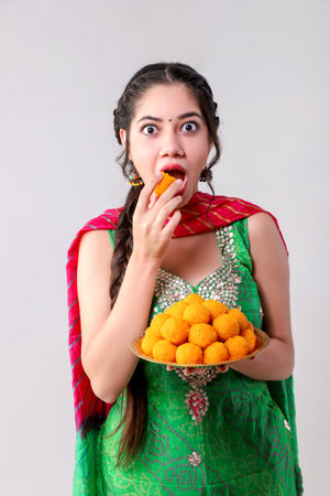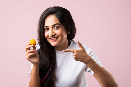 Pretty Indian young girl or woman eating sweet Gulab Jamun against pink background