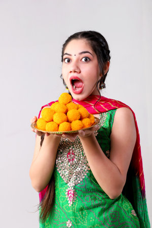 Surprised Indian young woman in traditional saree holding plate full of dumplings