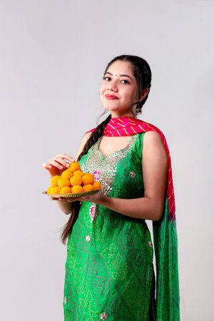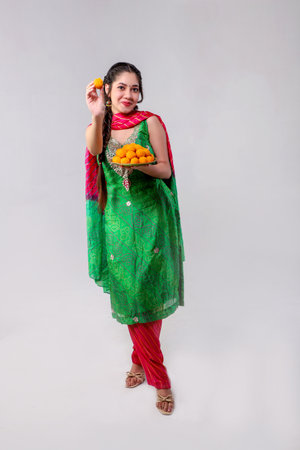 Beautiful Indian young girl holding pooja thali or performing worship on a white background