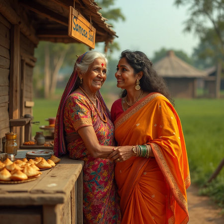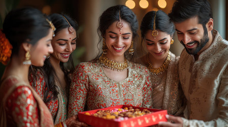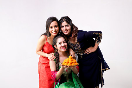 Teenage indian girls gathered around the festival food, celebrating Lohri