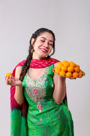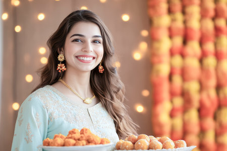 Smiling Woman Holding Festive Sweets in Traditional Attire with Decorative Lights
