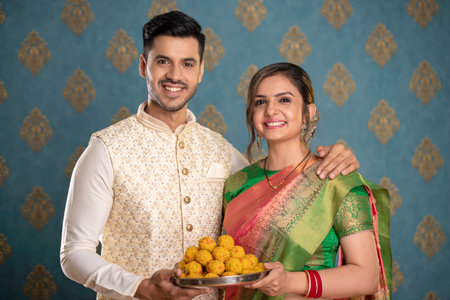 Teej festival - Colorful Couple in Traditional Clothing Celebrating, Space for Text