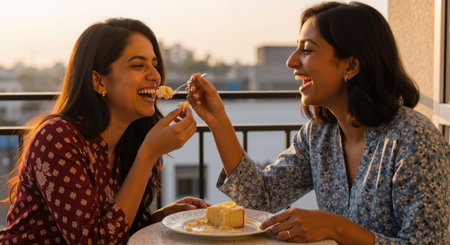 Two women share a slice of dessert cake with a table. Happy female friends eating sweet baked food.