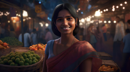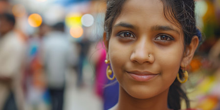 Portrait of a Young Woman Smiling in a Vibrant Outdoor Market Setting.