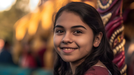 Close up smiling face, young indian girl playing on a swing, happiness, childhood, freedom, vitality, outdoor fun, carefree, sunlight. Generative AI AIG20.