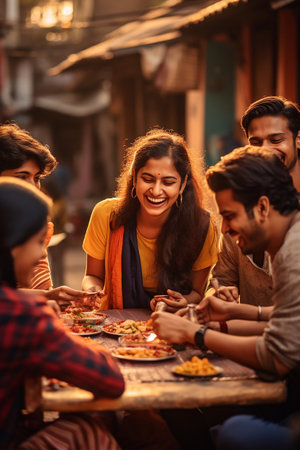 Group of Indian friends sitting at cafe table, talking and laughing.