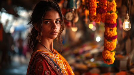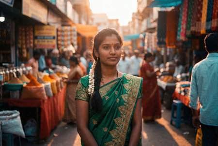 A beautiful young indian woman with jasmine flowers in her braided hair wears an emerald green sari with gold embroidery while standing in a crowded street market filled with spices and textiles.