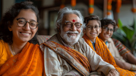 Cheerful multi-generational Indian family posing with genuine smiles. Elderly grandfather, adult daughter, and young boys in traditional Indian dress, exuding warmth and happiness.