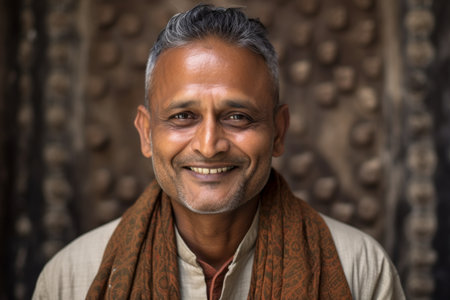 Portrait of a smiling Indian man with brown shawl.