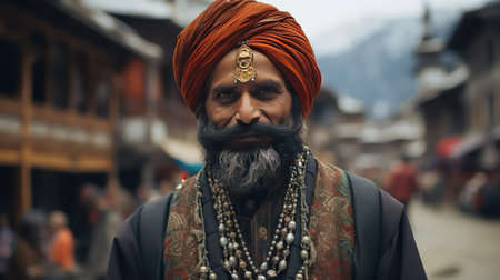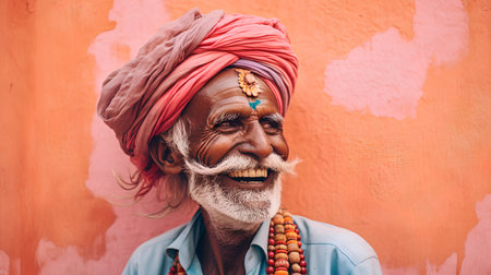 Portrait of a happy Indian man with red turban and beard