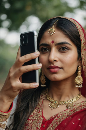 Woman in traditional attire taking a selfie outdoors during a cultural celebration in natural surroundings