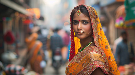 Indian woman in a vibrant, gold-embroidered sari, adorned with traditional jewelry, amidst busy streets.
